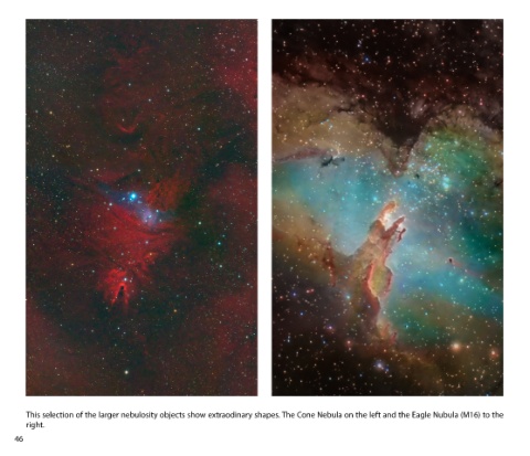 This selection of the larger nebulosity objects show extraodinary shapes. The Cone Nebula on the left and the Eagle Nubula (M16) to the right. 46