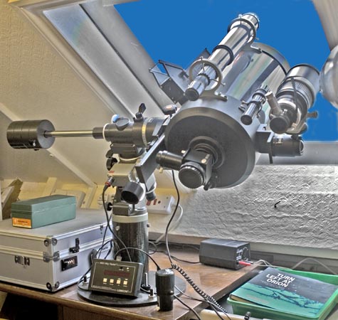 This is my old telescope setup. It is actually installed in my loft and faces out (directly south) through a velux window. This setup has many restrictions on what can be viewed when. For best viewing particularly of planets I have to let the loft equilibrate with the outside temperature before viewing. It does however have three key advantages . One, it is a permanent setup that can be used quickly with no time lost transporting, setting up and aligning. Two, it enables direct connection to a PC for telescope guiding and camera connection and three, its always dry! |
