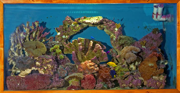 Our current reef tank is a more manageable 65 gallons capacity. Technically it is quite complex as it is housed in a chimney breast with a second sump tank and associated equipment situated in a cupboard in the garage behind the back wall of the tank. You can see this arrangement on the